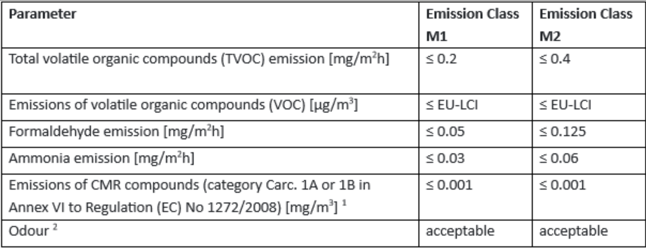 1. emission of formaldehyde < 60 μg/m³ and emissions of carcinogenic compounds < 1 μg/m³ (scope required for taxonomy reporting)
