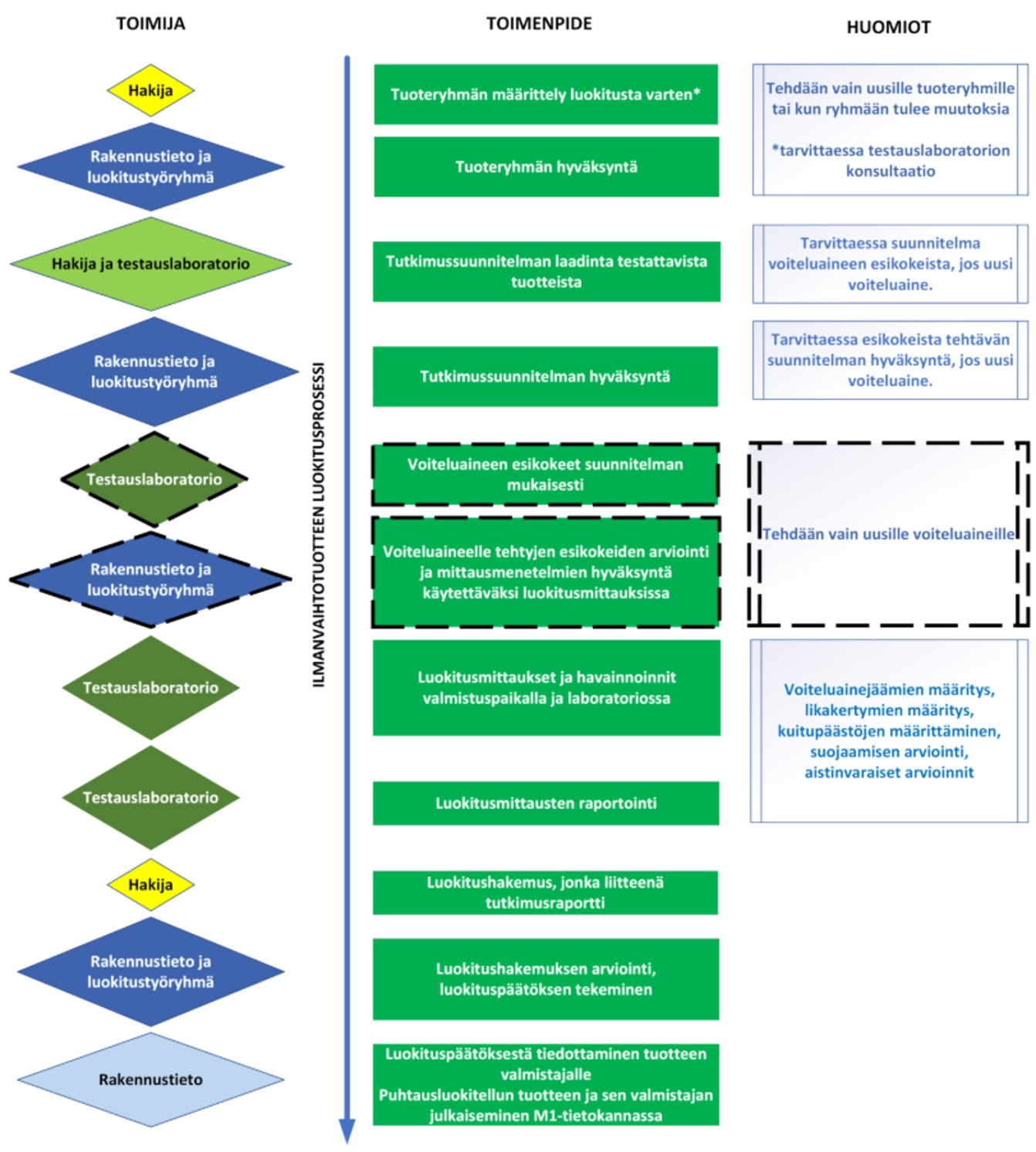 Jos tuotteella ei entuudestaan ole M1-luokitusta, voi valmistaja tai maahantuoja hakea M1-puhtausluokitusta testautettuaan tuotteensa ilmanvaihtotuotteiden testausohjeen mukaisesti hyväksytyssä testauslaboratoriossa. Luokitusta haettaessa testausraportti ei saa olla yhtä (1) vuotta vanhempi. Uuteen luokitushakemukseen tulee liittää seuraavat tiedot: